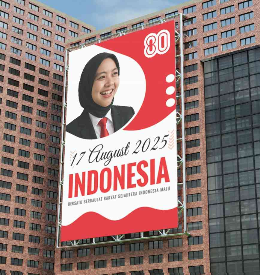 Baliho bertema nasionalisme HUT RI ini berbentuk persegi panjang vertikal, menonjolkan visual modern dengan dominasi warna merah dan putih, serta sent...