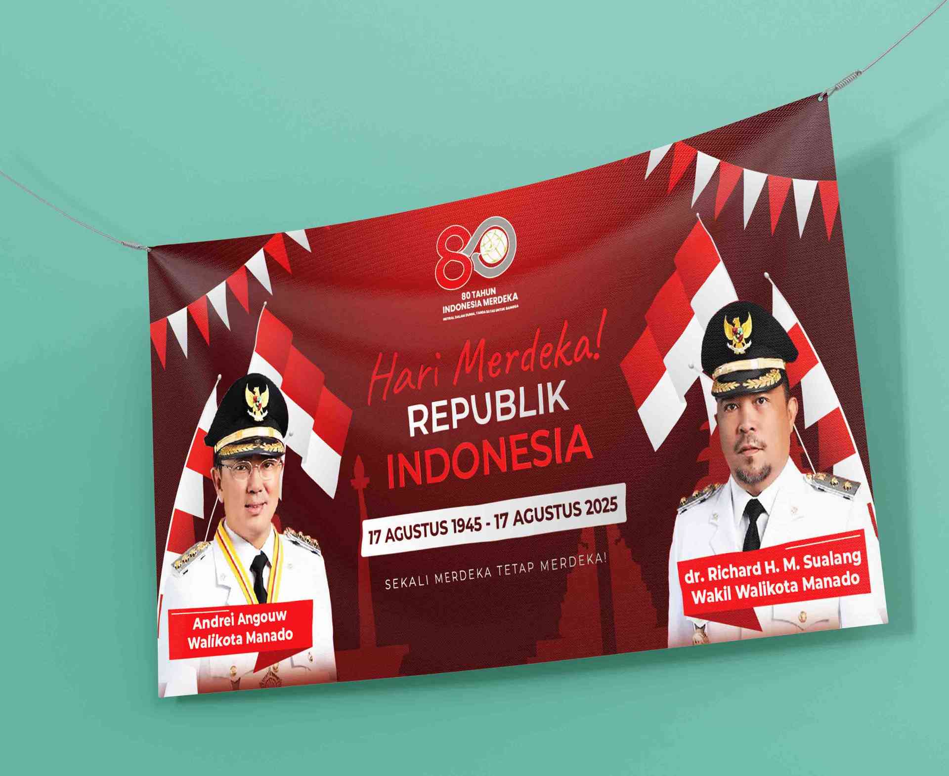 Spanduk peringatan Hari Kemerdekaan Republik Indonesia ke-80 ini menampilkan desain horizontal dengan dominasi warna merah dan putih, mencerminkan tema nasionalisme. Elemen visual utama berupa ilustrasi dua pejabat pemerintah berseragam putih, dipadukan pita merah-putih yang dinamis di kedua sisi. Tipografi besar “DIRGAHAYU REPUBLIK INDONESIA” berwarna merah menjadi pusat perhatian. Spanduk ini ditujukan untuk momentum perayaan kemerdekaan dan biasanya digunakan dalam acara resmi pemerintahan, perayaan publik, atau dekorasi di instansi serta ruang publik yang menargetkan masyarakat luas sebagai audiens utama.