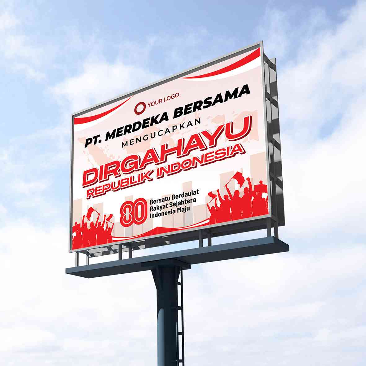 Baliho ucapan kemerdekaan yang didominasi warna merah dan putih ini berbentuk persegi panjang besar, menampilkan tipografi tegas bertuliskan “PT. MERDEKA BERSAMA Mengucapkan Dirgahayu Republik Indonesia” dengan angka peringatan 80 tahun kemerdekaan, serta slogan-slogan nasionalis. Elemen desain visual yang menonjol berupa siluet peta Indonesia berwarna samar di tengah dan ornamen modern yang memperkuat nuansa meriah. Tema visual nasionalisme sangat kental, sesuai untuk kebutuhan promosi perusahaan, organisasi, atau pemerintahan, menargetkan pasar publik pada momen peringatan Hari Kemerdekaan Indonesia.