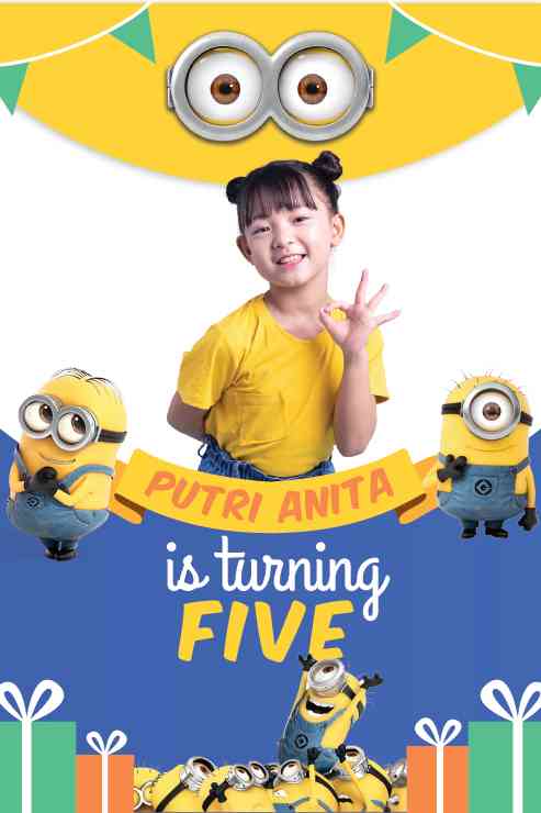 Di tengah baliho, terpampang besar angka usia sang penerima ulang tahun yang dikelilingi oleh gambar-gambar Minion yang berbagai pose, mulai dari mereka yang sedang tertawa riang hingga yang sedang melakukan kegilaan khas mereka. Latar belakangnya dipenuhi dengan hiasan balon berwarna-warni, termasuk balon yang membentuk wajah-wajah Minion yang menggemaskan.
