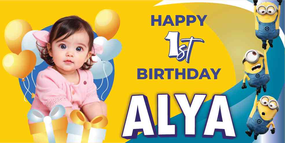 "Baliho berukuran besar yang memukau dengan latar belakang cerah dan penuh warna, menampilkan Minions, karakter lucu dari film animasi yang terkenal. Di tengah-tengahnya, terdapat gambar besar dari Minions yang tersenyum lebar, sambil memegang balon dan kue ulang tahun yang berwarna-warni. Di sekitarnya, terhampar dekorasi yang menggemaskan seperti bunga-bunga besar dan confetti yang melayang-layang. Tulisan 'Selamat Ulang Tahun!' yang ceria menghiasi bagian atas baliho, dengan angka usia yang bisa disesuaikan dengan acara ulang tahun yang sedang dirayakan. Keseluruhan desain memberikan kesan riang dan menyenangkan, sempurna untuk merayakan momen berharga bersama teman dan keluarga."