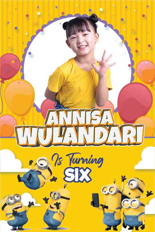 "Selamat datang di Pesta Ulang Tahun yang penuh kesenangan ala Minions! Dalam pesta ini, warna-warni ceria dan keceriaan tak terhindarkan. Di tengah baliho ini, para Minions dengan senang hati mengundang Anda untuk bergabung dalam perayaan yang penuh kegembiraan. Dikelilingi oleh gambar-gambar lucu dan ceria dari para Minions, baliho ini menjadi saksi dari momen berharga dalam perayaan ulang tahun yang tak terlupakan. Mari bergabung bersama kami dalam menghadirkan tawa dan keceriaan sejati, sesuai dengan semangat yang diusung oleh para Minions! Selamat Ulang Tahun yang penuh keceriaan!"