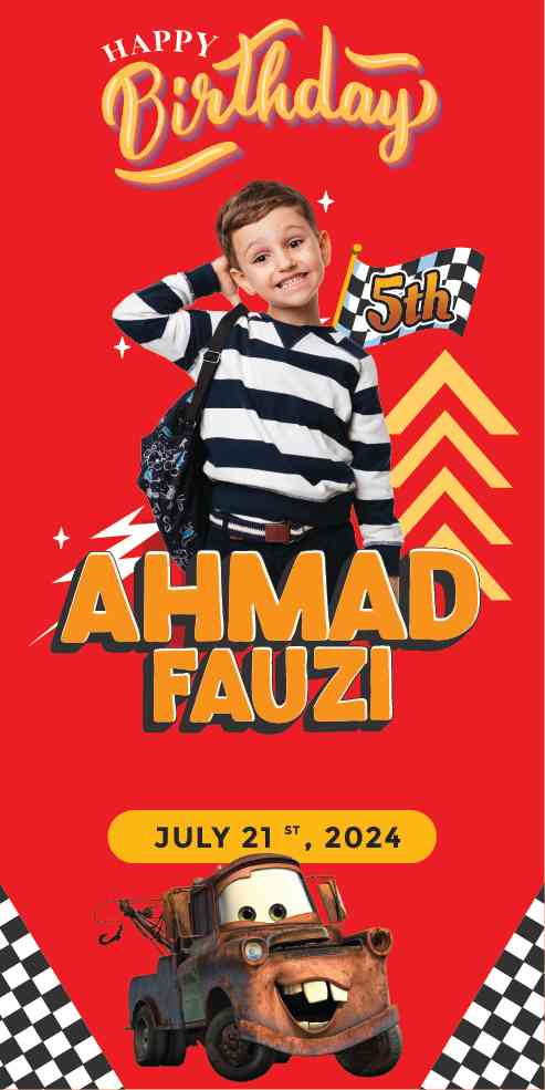 Selamat datang di Zona Balap Ulang Tahun yang penuh kecepatan! Standing banner ini menghadirkan semangat dari dunia Cars Disney yang menawan, memperse...