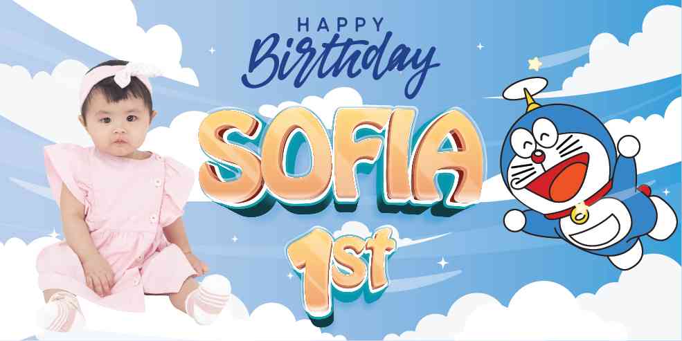 "Tampilan baliho ulang tahun dengan tema Doraemon adalah kombinasi sempurna antara kesenangan dan keajaiban. Di tengah-tengah latar belakang yang cera...
