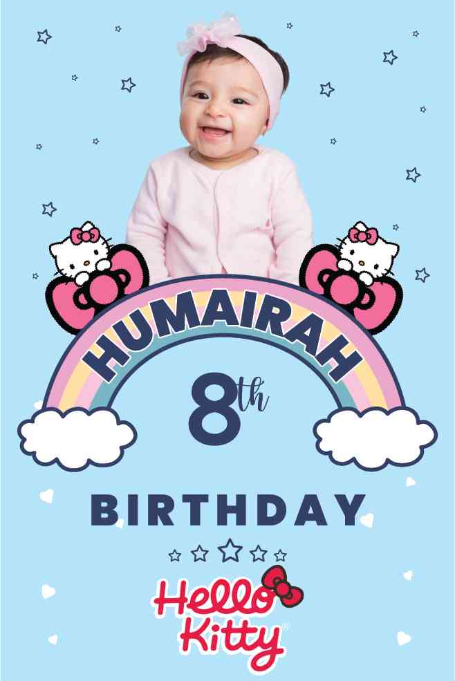 Baliho yang memukau menghiasi langit-langit kota dengan tema ulang tahun yang memikat, Hello Kitty. Dengan latar belakang yang dipenuhi warna-warna ce...