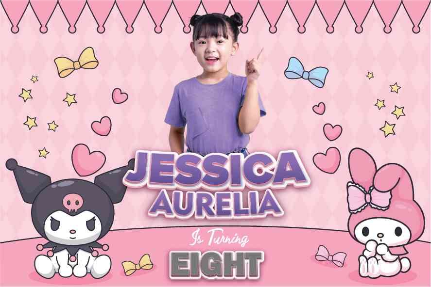 Mari rayakan ulang tahun yang penuh keceriaan dengan tema Kuromi yang penuh gaya ini! Baliho ini menampilkan Kuromi, karakter imut dengan gaya gothic yang khas, dalam serangkaian aksi lucu dan menggemaskan. Latar belakangnya dihiasi dengan palet warna ungu gelap dan hitam yang mencolok, dengan sentuhan bintang-bintang dan bulan untuk menambahkan nuansa magis.