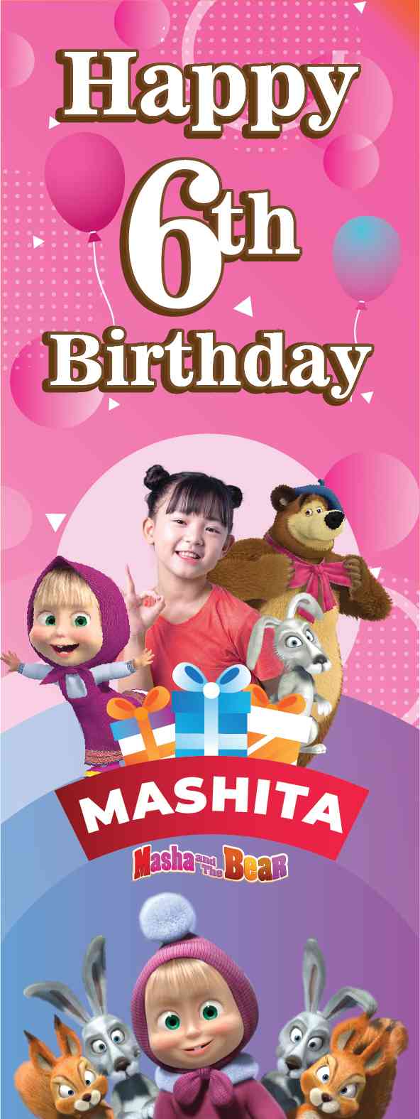 Desain baliho ini adalah sebuah penggambaran yang memukau dari keajaiban dan keceriaan yang tak terbatas dari dunia Masha and the Bear, membuat pesta ulang tahun anak Anda menjadi sebuah petualangan ajaib yang tak terlupakan!