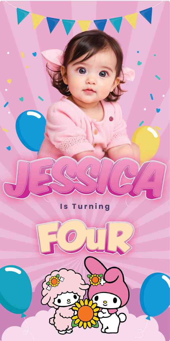Selamat datang di Pesta Ulang Tahun yang penuh keceriaan dengan tema My Melody! Terpancarkan kegembiraan di setiap inci baliho ini yang memukau, dihiasi dengan gambar indah My Melody yang memikat hati. Latar belakangnya berwarna pastel yang lembut, menampilkan My Melody dalam berbagai pose manis yang pasti mengundang senyum dari setiap tamu yang lewat. Detail-detail kecil seperti bunga-bunga kecil dan sentuhan berlian yang bersinar menambah kesan magis pada dekorasi ini. Baliho ini tidak hanya memperingati momen spesial ulang tahun Anda tetapi juga menghadirkan nuansa kehangatan dan kebahagiaan yang tidak terlupakan. Segera bergabunglah dalam perayaan ini dan nikmati keajaiban My Melody yang membawa kebahagiaan!