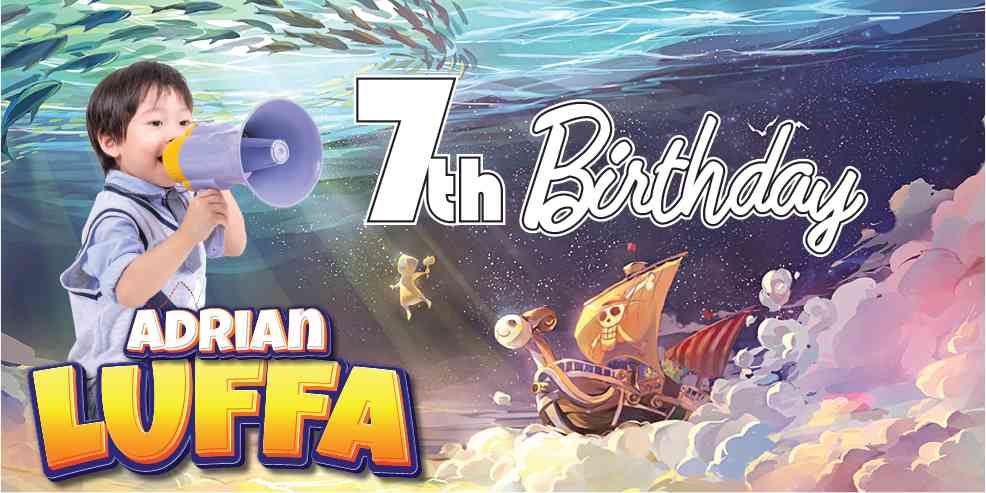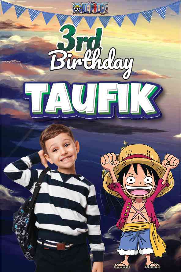 Baliho ulang tahun dengan tema One Piece adalah perpaduan yang sempurna antara kegembiraan petualangan dan semangat persahabatan. Di tengah baliho yang mencolok, tokoh-tokoh utama seperti Luffy, Zoro, dan kru Topi Jerami tergambar dengan penuh semangat, siap untuk menjalani petualangan epik berikutnya.