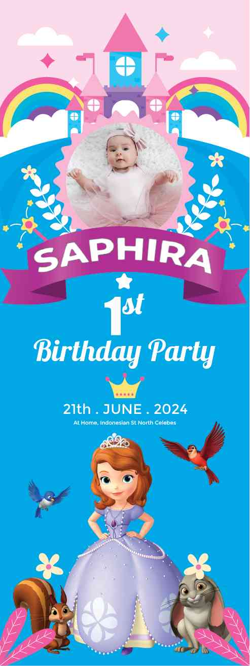Di bawah langit biru yang cerah, baliho ulang tahun dengan tema Princess Sofia menawarkan pengalaman magis yang tak terlupakan. Latar belakangnya dihi...