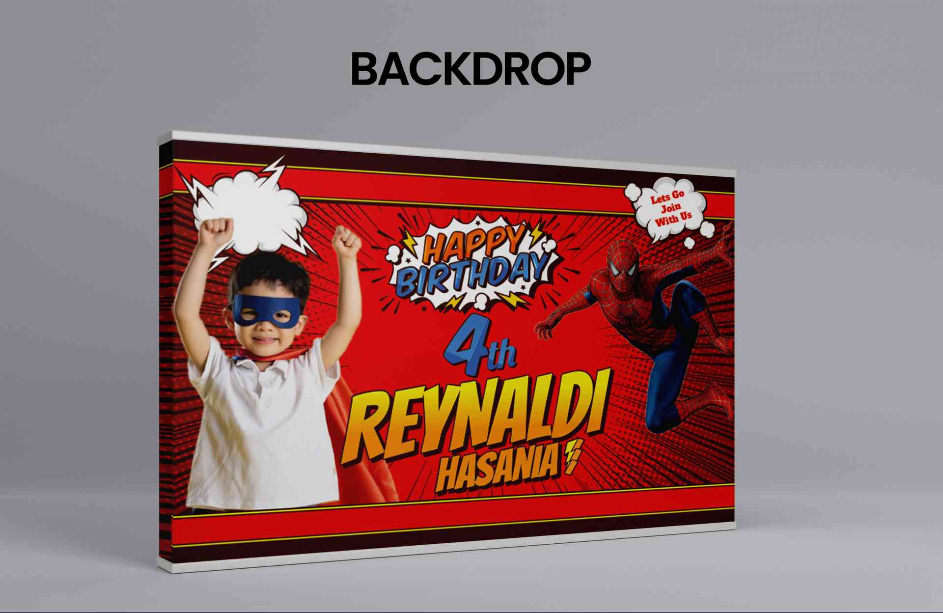 Jaring laba-laba yang terbentang di sekitar baliho menciptakan aura petualangan yang menggetarkan, seolah-olah para tamu diundang untuk bergabung dalam misi superhero yang mengasyikkan. Tulisan "Happy Birthday" yang mencolok dengan gaya ikonik Spiderman menambahkan sentuhan kegembiraan yang tak tertandingi.