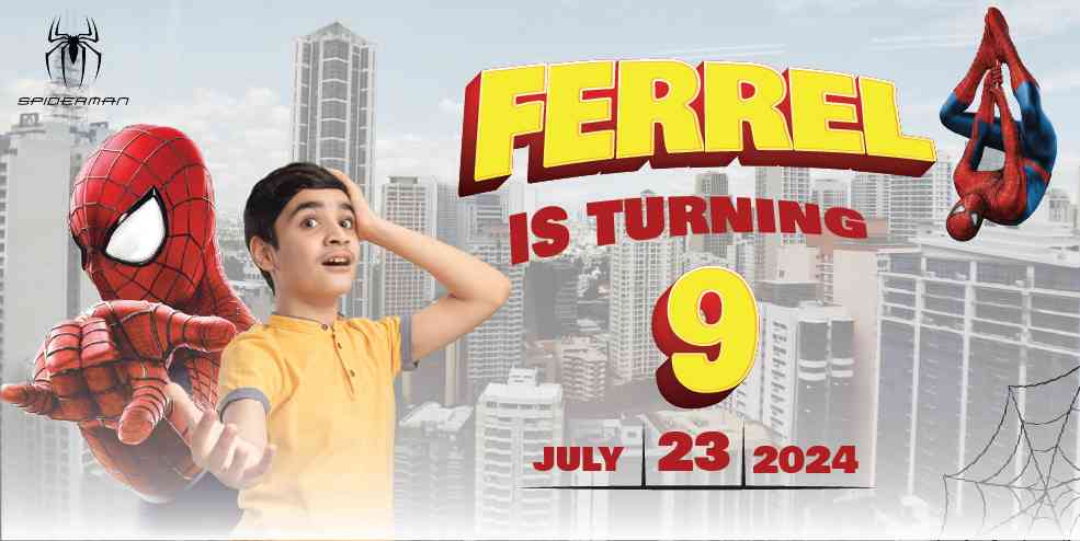 Jaring-jaring laba-laba yang melingkari baliho menambahkan sentuhan aksi dan petualangan, sementara lampu neon yang bersinar mencerahkan suasana pesta. Tulisan "Happy Birthday" yang besar dengan gaya logo Spiderman yang khas menambahkan kesan yang ceria dan menyenangkan.