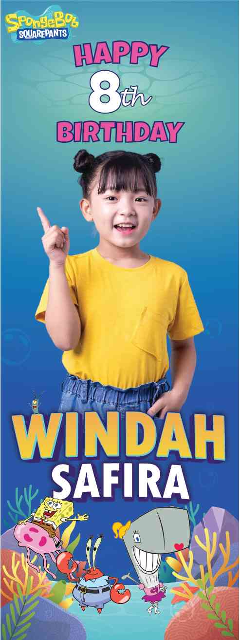 Latar belakang baliho ini dipenuhi dengan pemandangan laut yang indah, dengan karang-karang berwarna-warni dan ikan-ikan yang berenang riang. Di atasnya, tulisan-tulisan berwarna-warni menyambut dengan hangat, memberikan ucapan selamat ulang tahun kepada SpongeBob dengan gaya yang ceria dan kocak, sesuai dengan atmosfer yang selalu hadir dalam petualangan-petualangan mereka di Bikini Bottom.