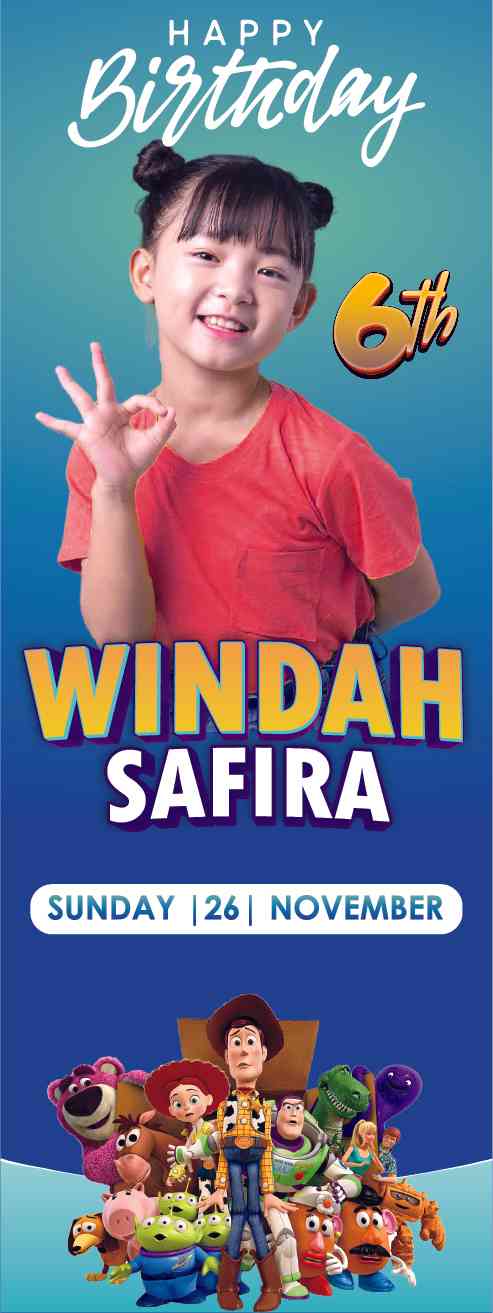 Di bagian atas banner, tulisan "Selamat Ulang Tahun" atau "Happy Birthday" dipampang dengan gaya yang ceria dan bersemangat, mencerminkan kesenangan dari perayaan tersebut. Jangan lupa untuk menambahkan nama anak yang berulang tahun untuk memberikan sentuhan personal pada banner tersebut, memastikan bahwa hari itu menjadi lebih istimewa bagi mereka.