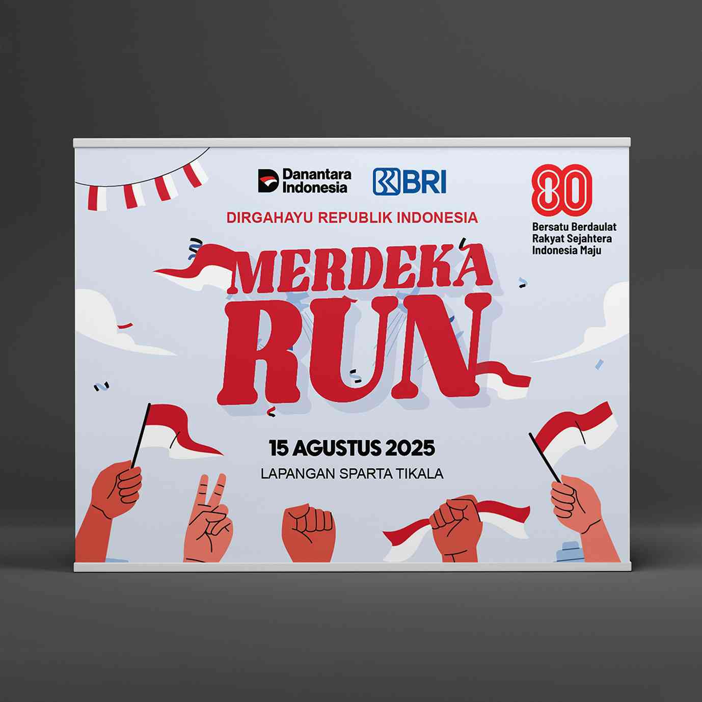 Backdrop event bertema “Running Kemerdekaan 17 Agustus” dengan dominasi warna putih, menampilkan teks utama “MERDEKA RUN” berukuran besar dan tebal be...