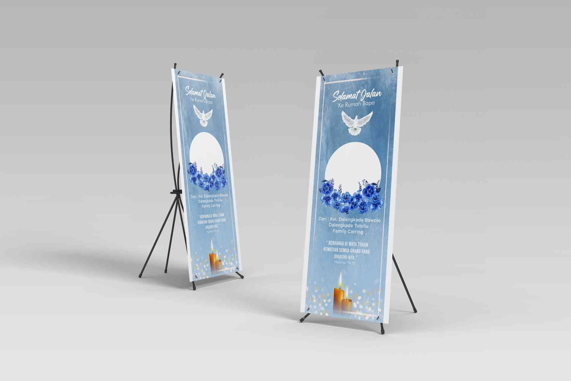 Banner duka berukuran 60x160cm ini dirancang dengan sederhana namun penuh penghormatan, cocok untuk menyampaikan rasa empati dan belasungkawa dalam momen berduka. Dengan desain yang elegan dan warna-warna yang menenangkan, banner ini menjadi pilihan tepat untuk menghormati almarhum dengan cara yang sopan dan penuh penghargaan.