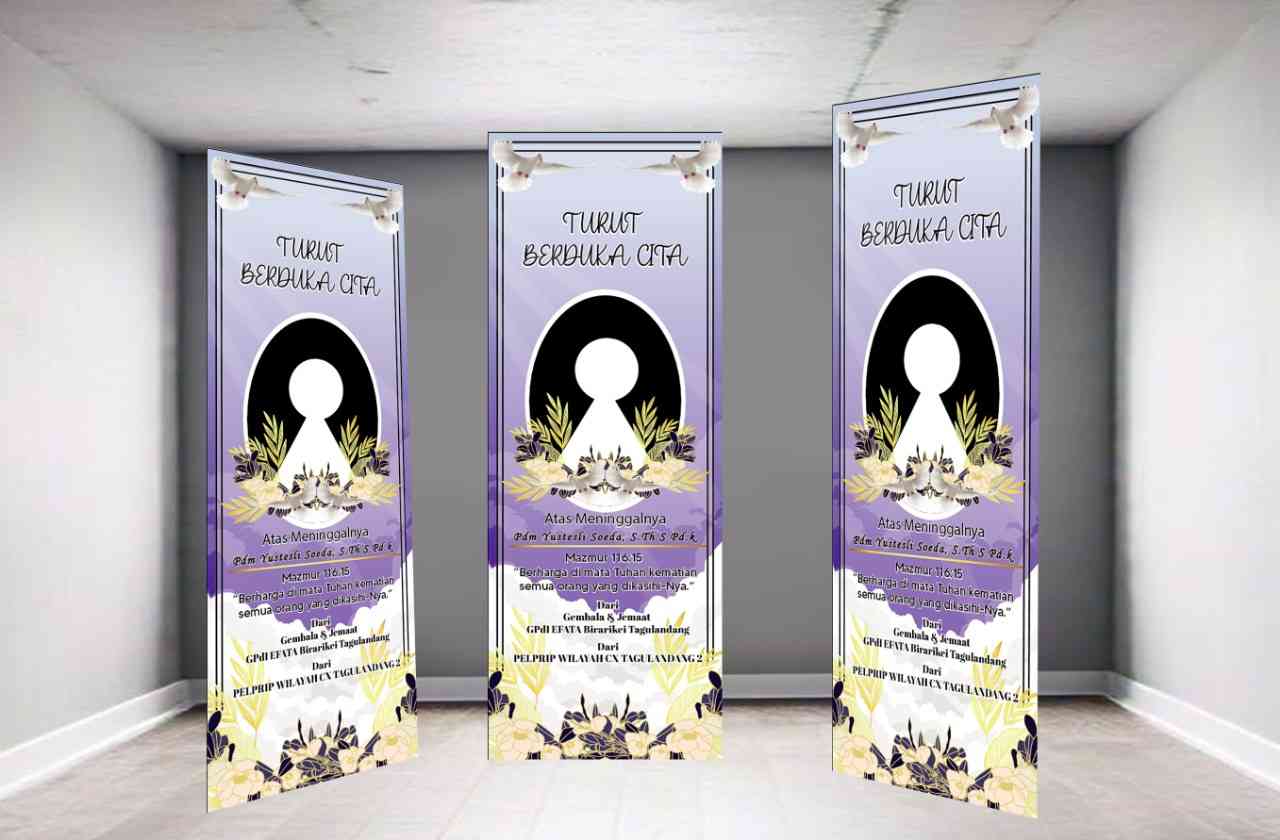 Desain x-banner ini dibuat untuk memberikan penghormatan terakhir yang anggun dan berkelas, dengan dominasi warna hitam legam yang dipadukan dengan el...