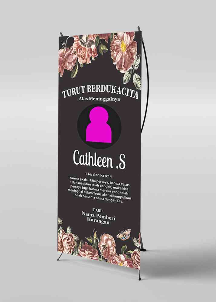 Banner duka cita berwarna dasar hitam ini didesain dengan bentuk vertikal dan menonjolkan kesan elegan melalui hiasan bunga mawar gelap di bagian atas...