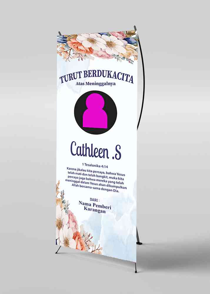 Banner duka cita ini didesain dengan nuansa lembut dan tenang, didominasi oleh warna putih dan biru keabu-abuan yang menggambarkan kesedihan dan ketulusan hati. Di bagian atas terdapat tulisan "Selamat Jalan Kakak Tersayang" sebagai ungkapan perpisahan yang penuh kasih. Potret siluet mendiang ditempatkan di tengah dengan bingkai bulat yang elegan. Tercantum juga nama lengkap, tahun lahir dan wafat, serta kutipan ayat penghiburan dari 2 Timotius 4:7, memberikan sentuhan religius dan harapan. Dekorasi bunga dengan tone monokrom biru-putih menambahkan kesan damai dan menghormati. Di bagian bawah, tercantum nama-nama keluarga atau kerabat yang menyampaikan belasungkawa. Banner ini cocok digunakan dalam acara persemayaman, pemakaman, atau bentuk penghormatan terakhir lainnya.