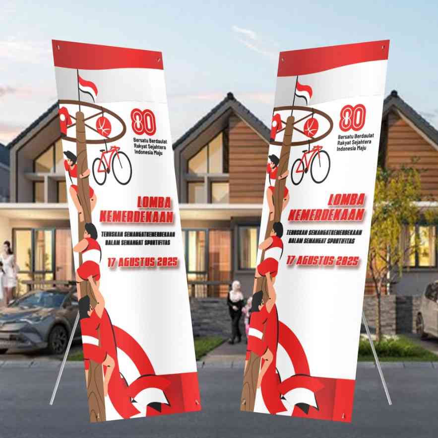 Banner lomba kemerdekaan berupa banner vertikal dengan bentuk persegi panjang tegak, didominasi warna merah dan putih yang mencerminkan nuansa nasiona...