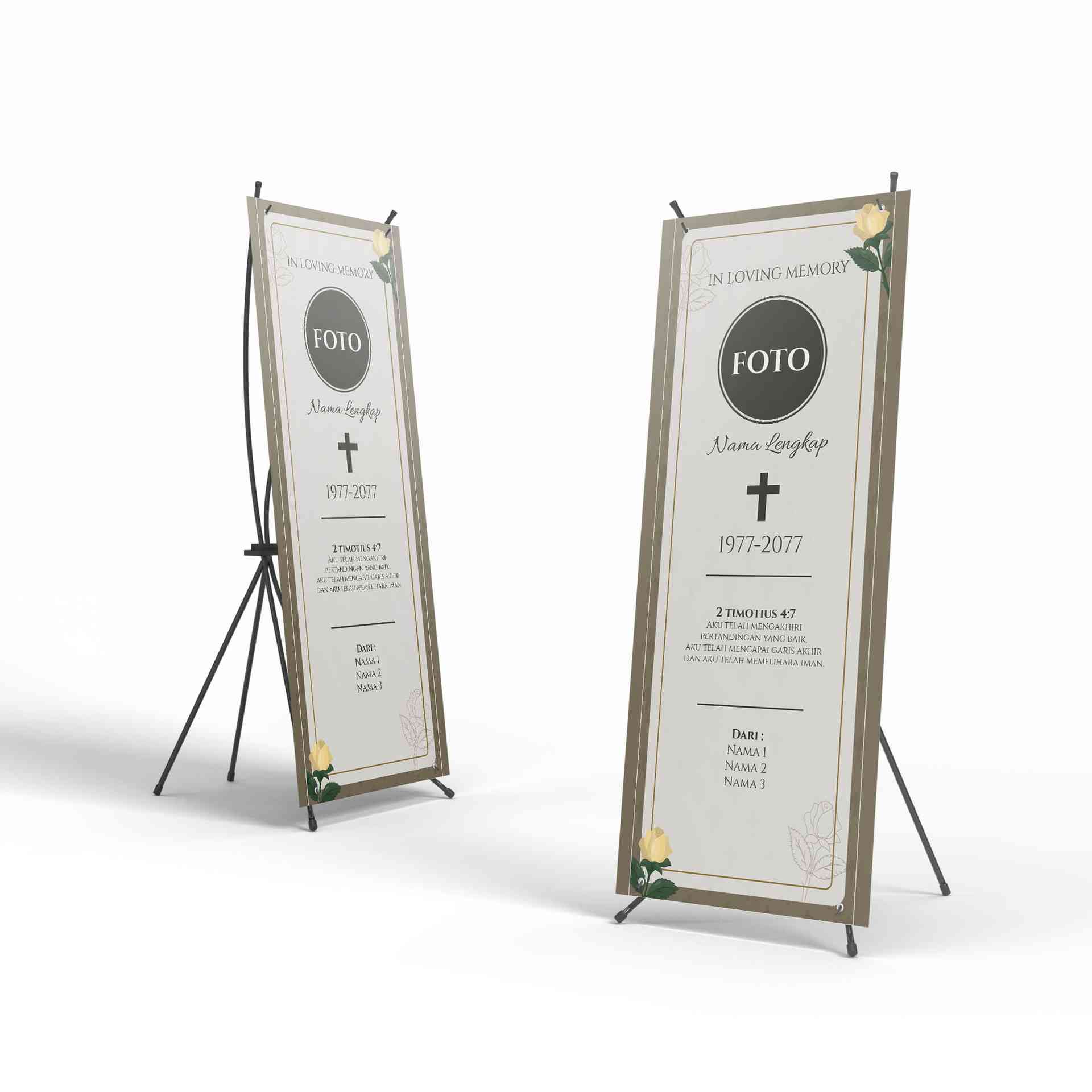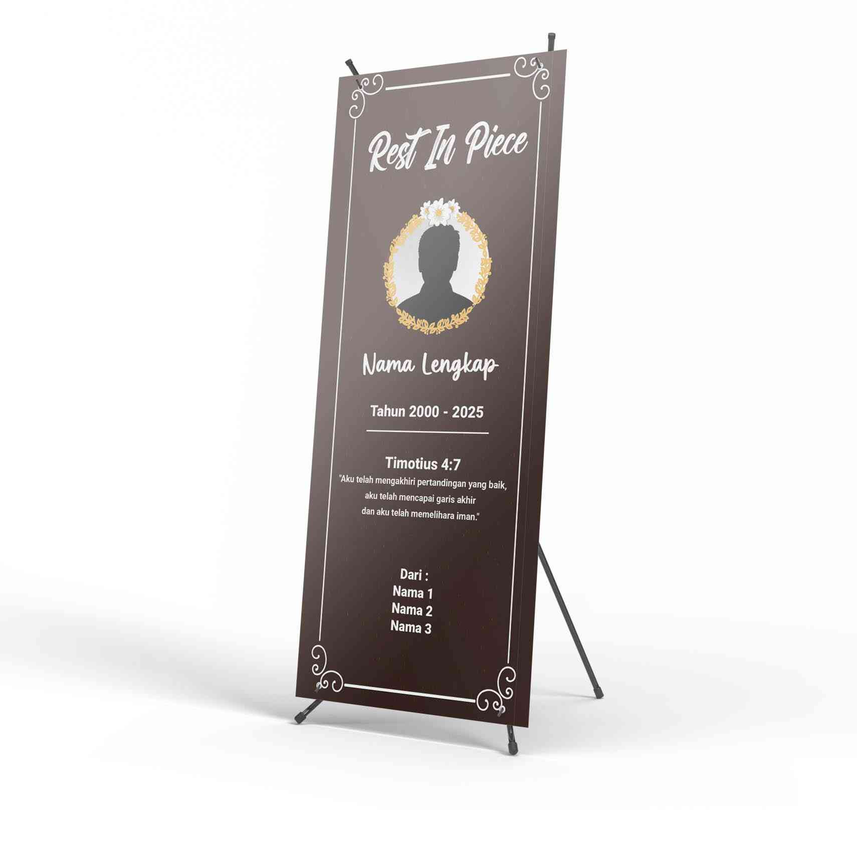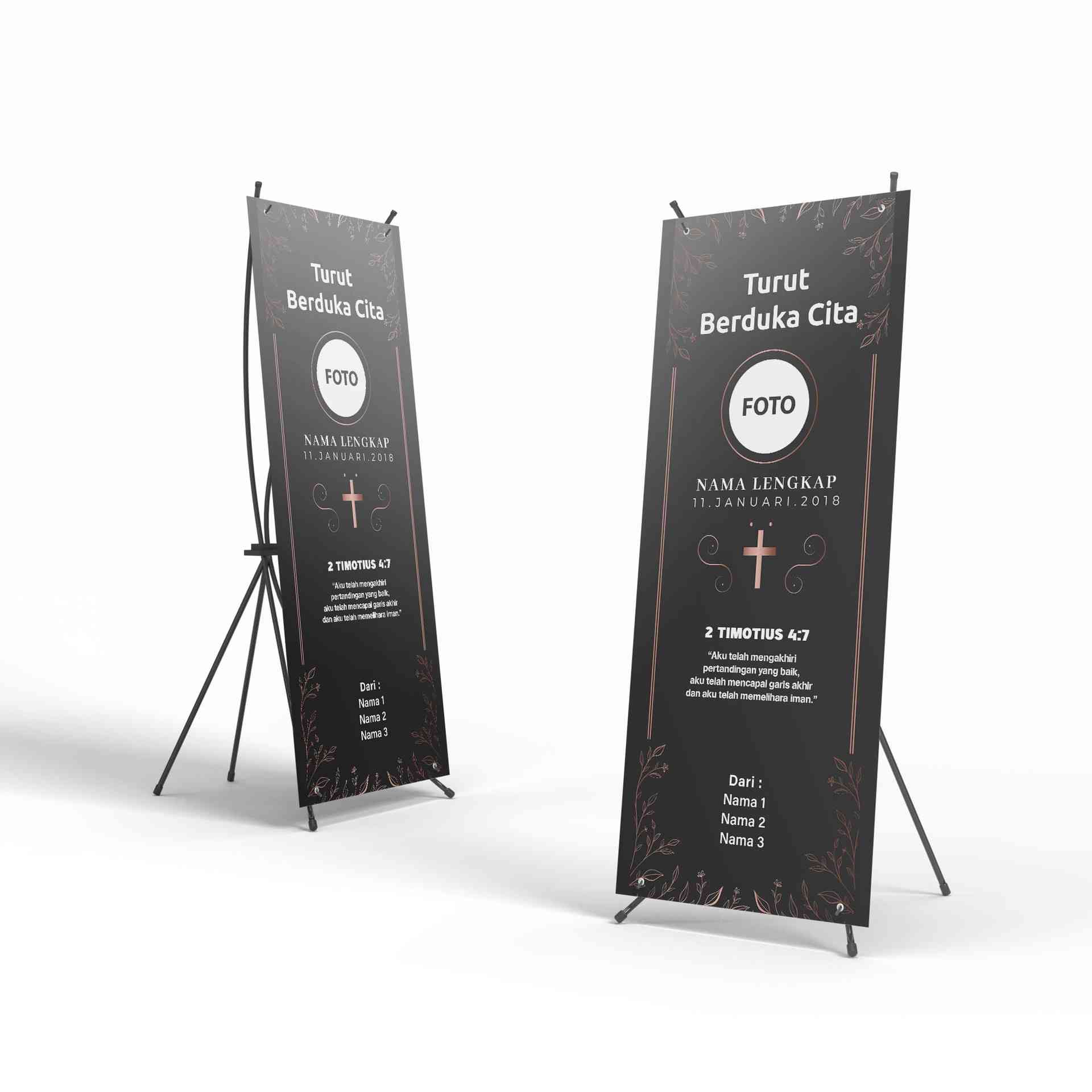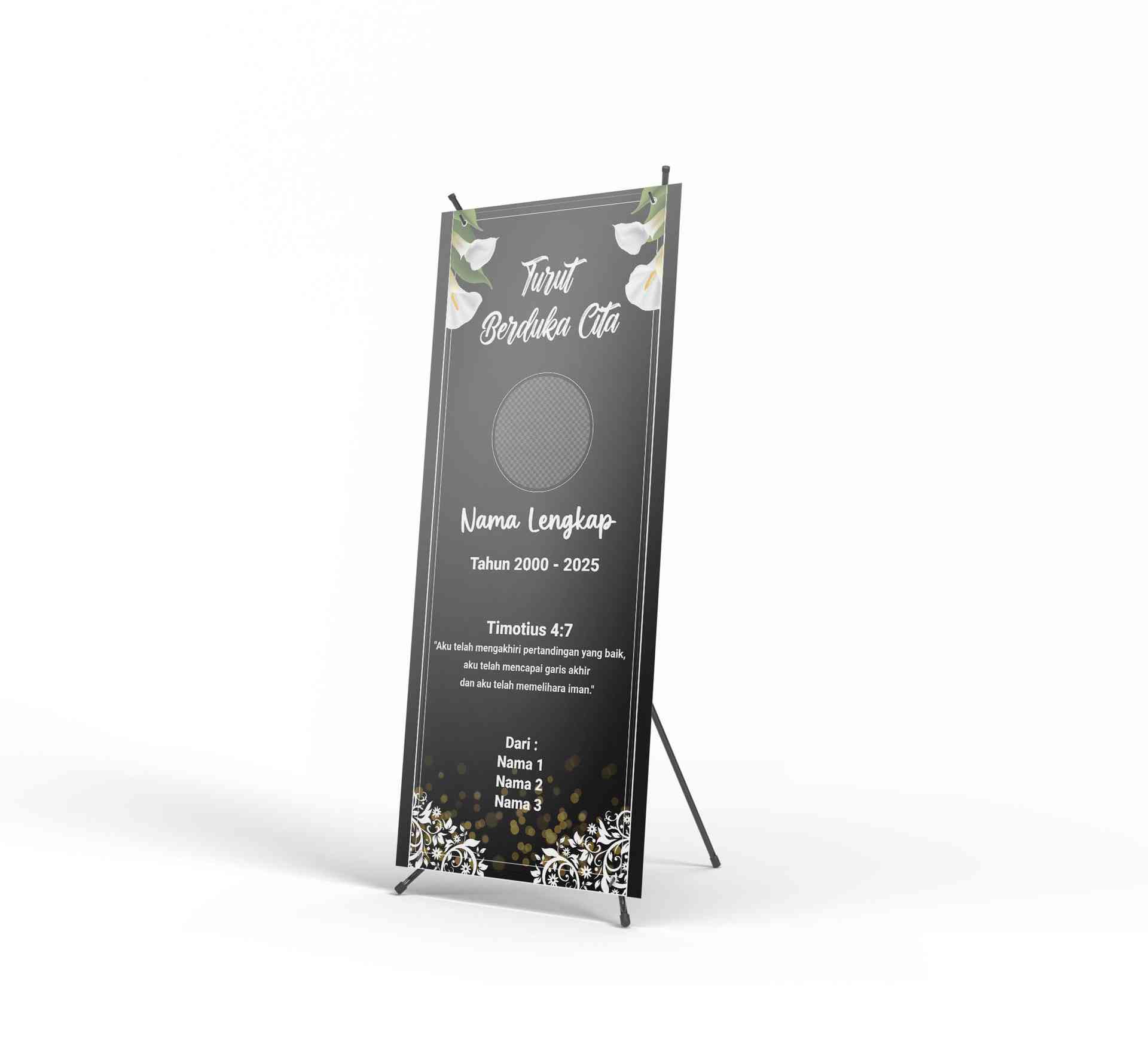 banner ucapan belasungkawa. Secara visual, banner ini memiliki bentuk vertikal dengan latar belakang bernuansa abu-abu dengan gradasi gelap ke terang....