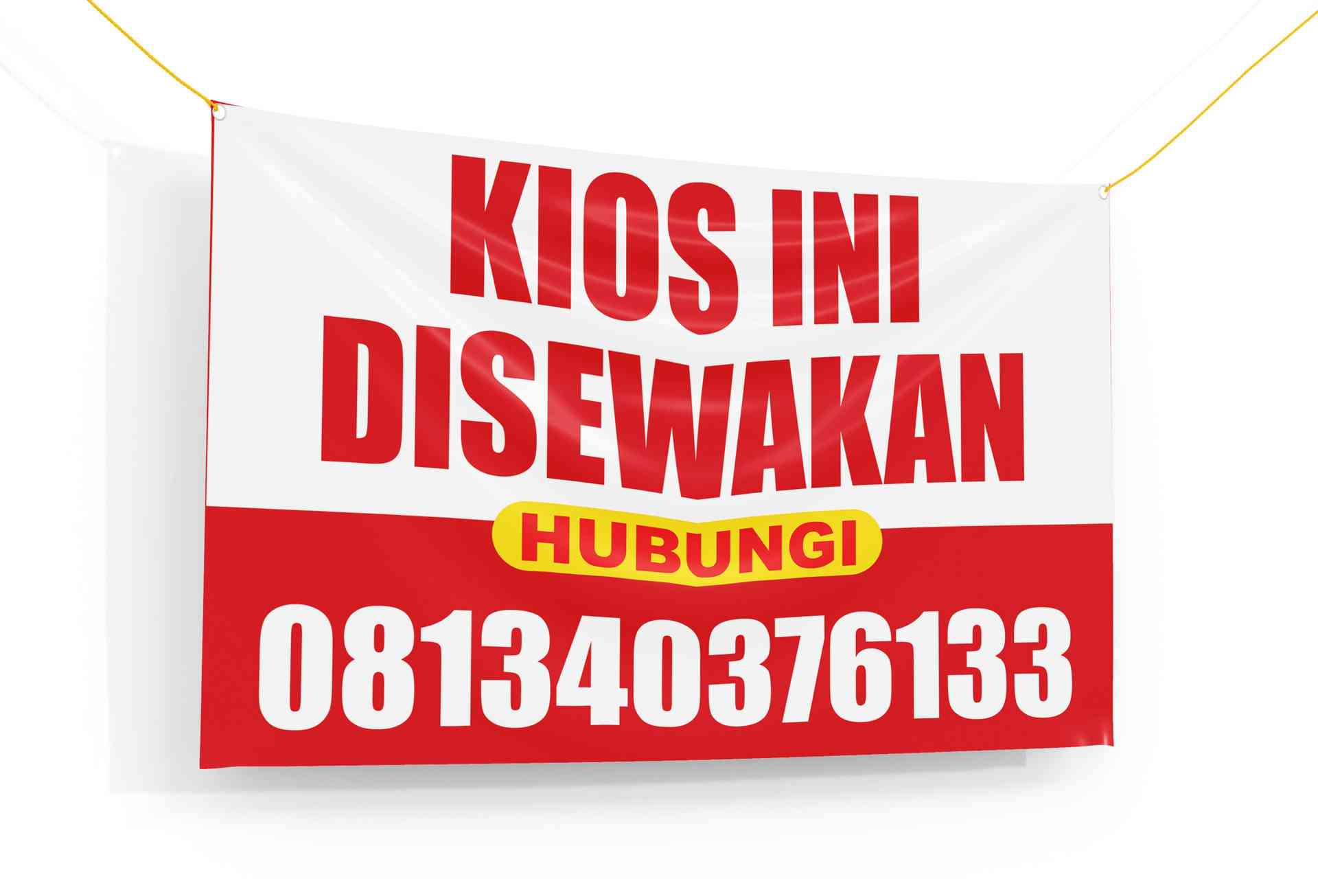 Banner ini menampilkan teks besar dan jelas dengan warna merah mencolok yang menarik perhatian orang yang lewat. Teks utama "KIOS INI DISEWAKAN" mengg...