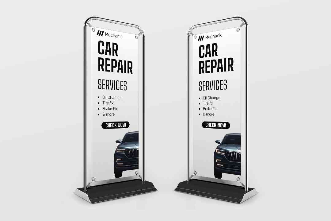 Banner roll-up untuk layanan cuci mobil ekspres yang menawarkan berbagai paket layanan cuci mobil dengan harga terjangkau. Paket yang tersedia mencaku...
