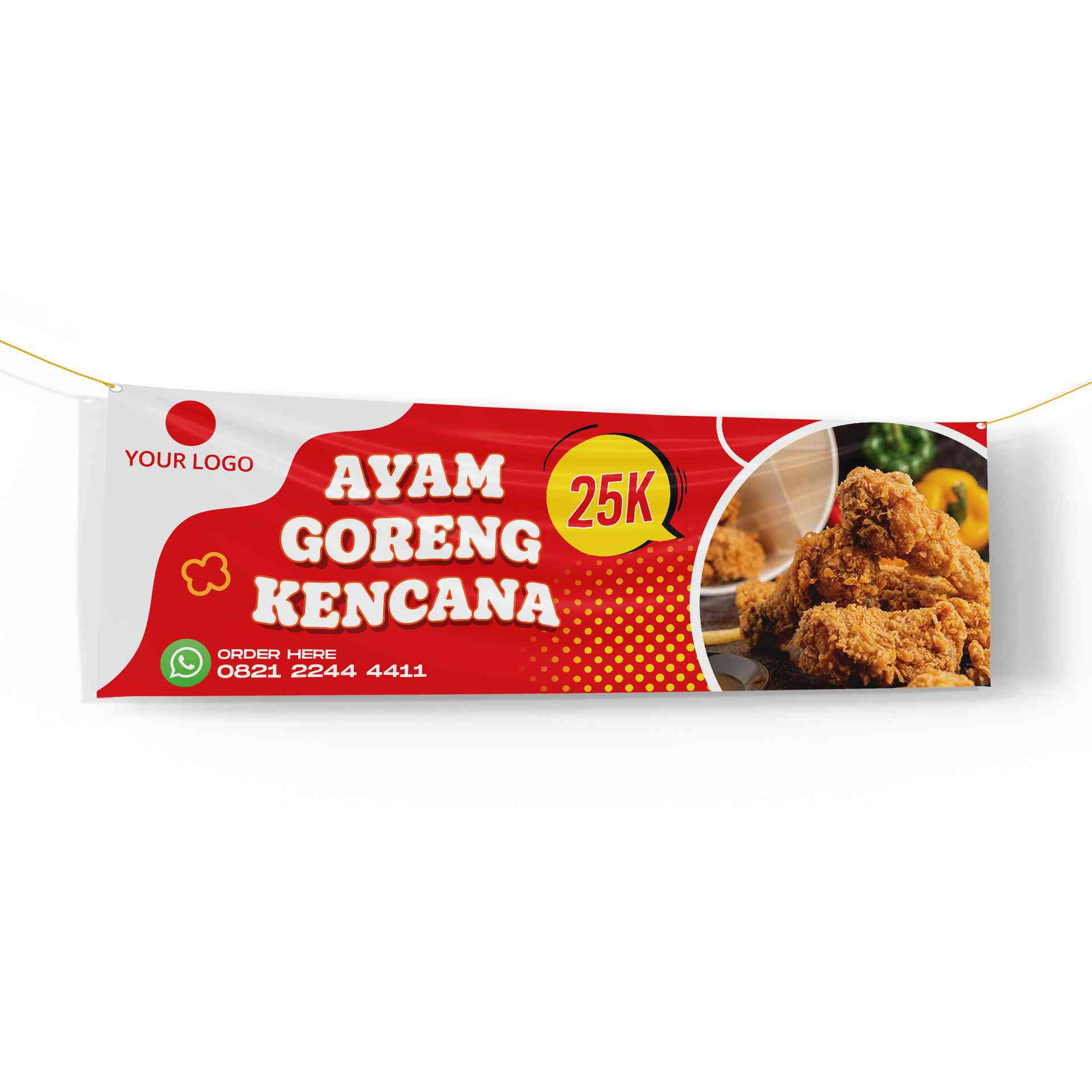 Spanduk ini menampilkan kombinasi merah tua dan oranye yang hangat. Di sisi kiri terdapat foto ayam goreng yang juicy dengan sayur pelengkap, sedangka...