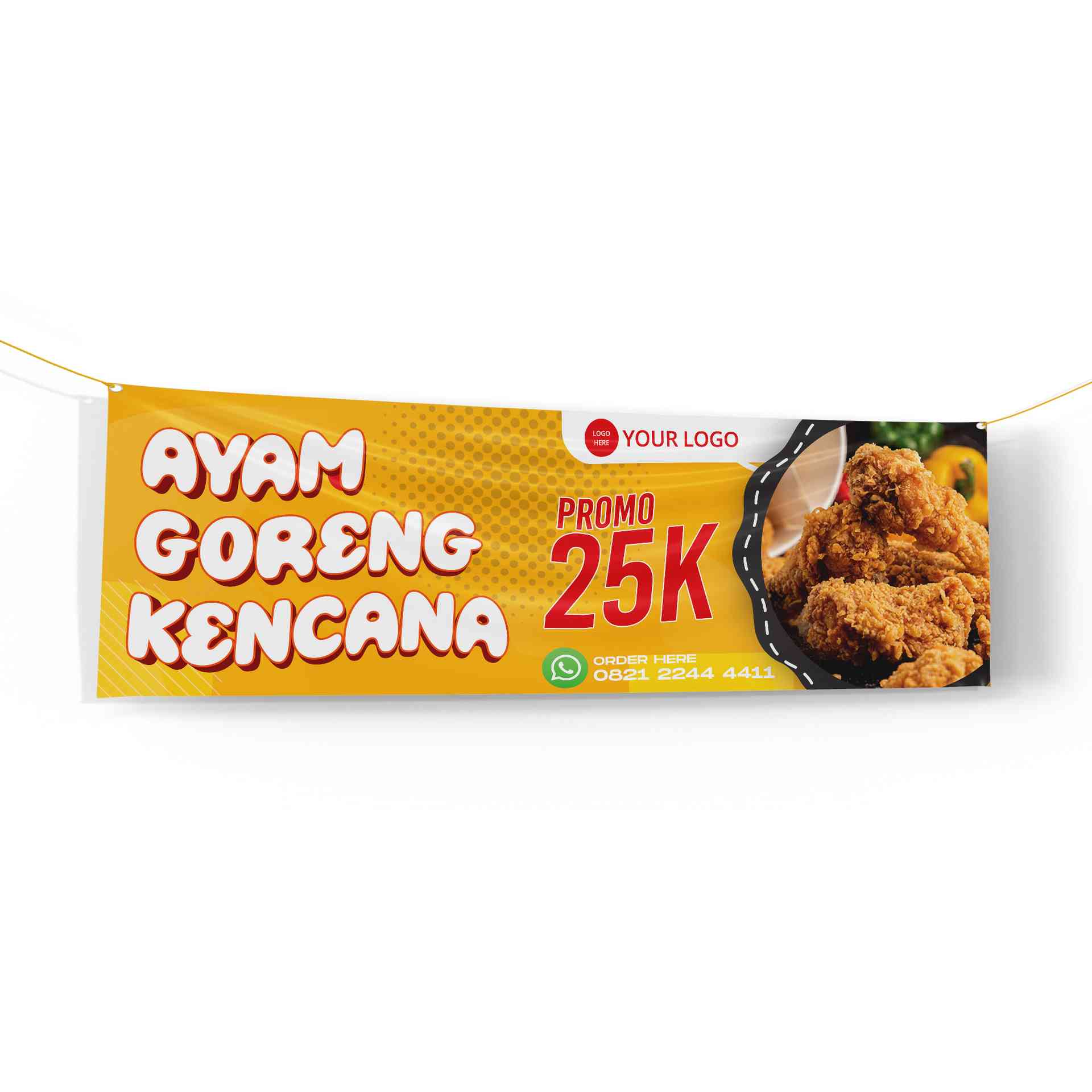 Spanduk ini memadukan nuansa hijau alami dan aksen kuning cerah, menampilkan foto ayam goreng dan sayuran di sisi kiri yang menggoda. Teks “25K” dicet...