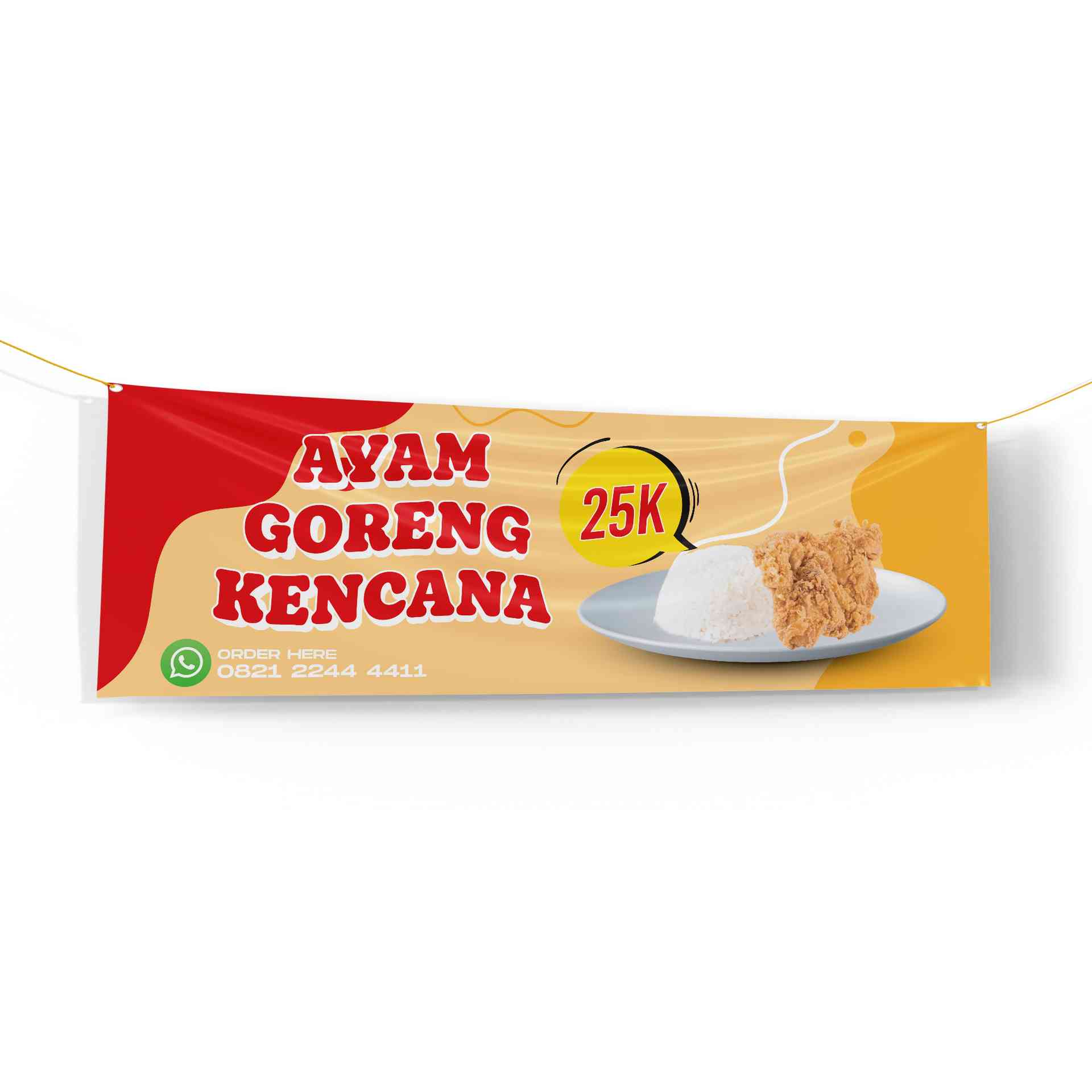 Banner ini menonjolkan warna kuning terang dengan gelombang dekoratif yang menarik mata. Foto ayam goreng dan nasi tampil di sisi kiri, sementara teks...
