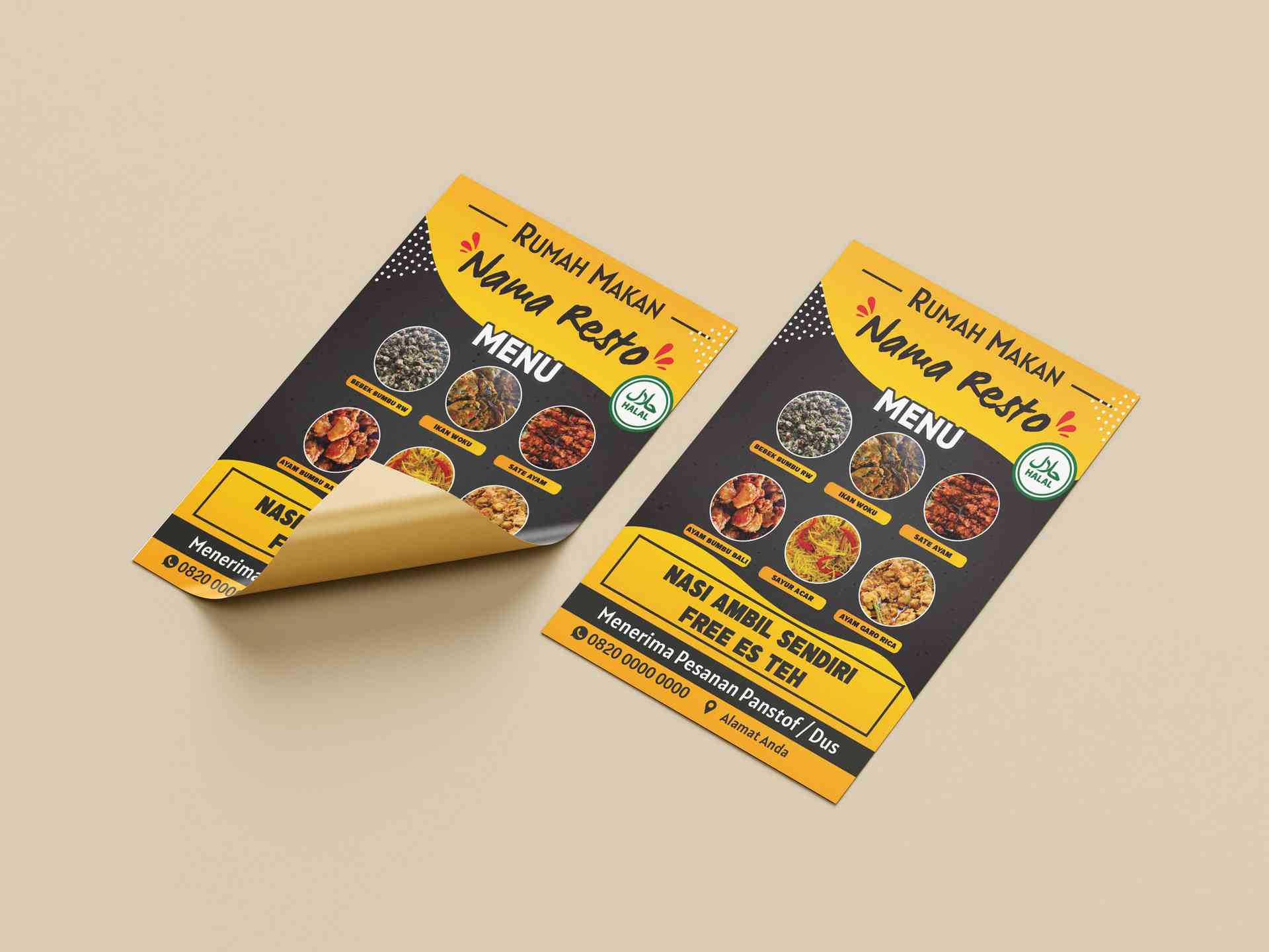 Deskripsi :Flyer promosi rumah makan dengan desain modern berwarna dominan kuning dan hitam, menampilkan berbagai pilihan menu tradisional khas Indone...