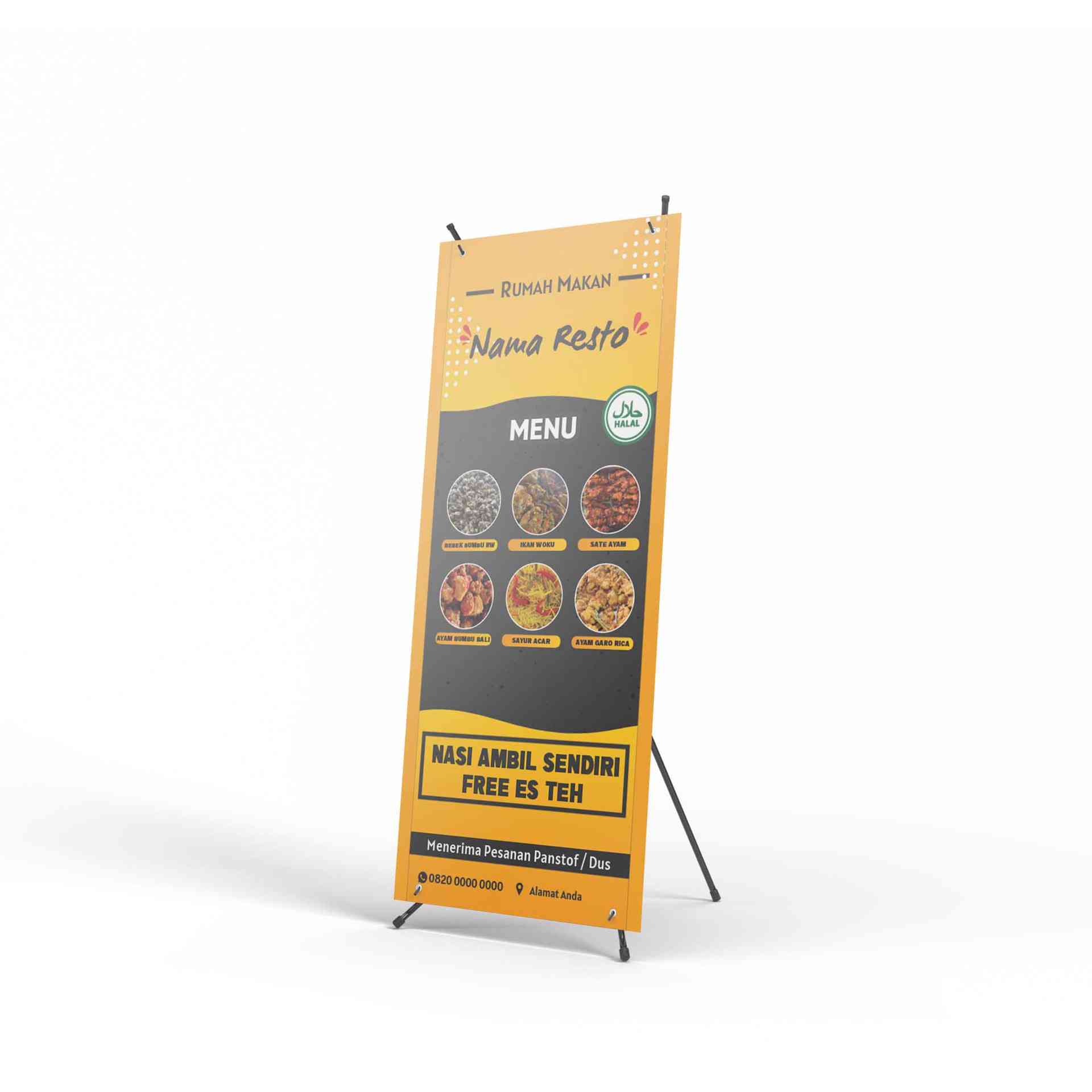 Deskripsi lengkap tentang X-Banner:Jenis Produk: X-Banner (Standing Banner)Ukuran Perkiraan: Umumnya 60x160 cm atau 80x180 cm (berdasarkan proporsi vi...