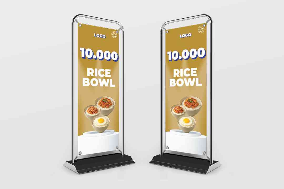 Banner cetak promosi berbentuk vertikal dengan warna dominan kuning keemasan menampilkan informasi harga “10.000” dan teks besar “RICE BOWL” sebagai p...