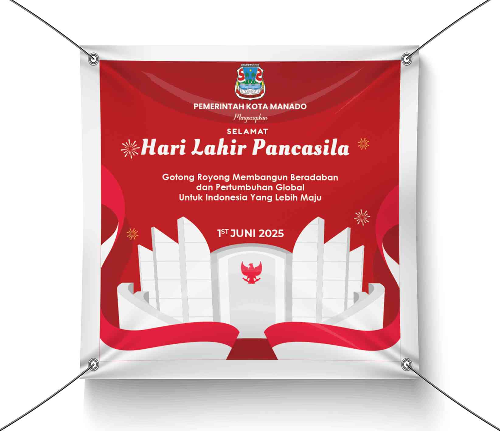 Banner ini memperingati Hari Lahir Pancasila pada tanggal 1 Juni 2025 dengan tema Bhinneka Tunggal Ika, yang menekankan persatuan dalam keberagaman ba...