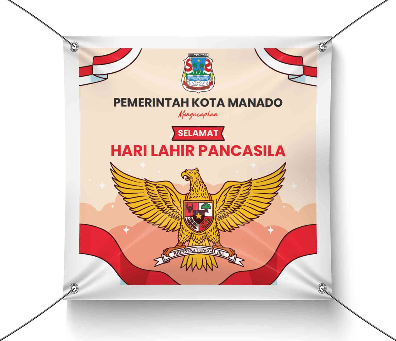 Banner ini memperingati Hari Lahir Pancasila dengan tema Bhinneka Tunggal Ika, yang menekankan keberagaman dan persatuan bangsa Indonesia. Desain bann...