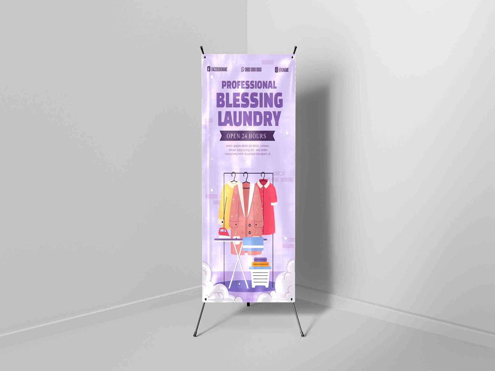 X Banner Blessing Laundry Cuci Setrika merupakan media promosi berbentuk banner vertikal dengan tema layanan laundry. Visual utama menampilkan ilustra...