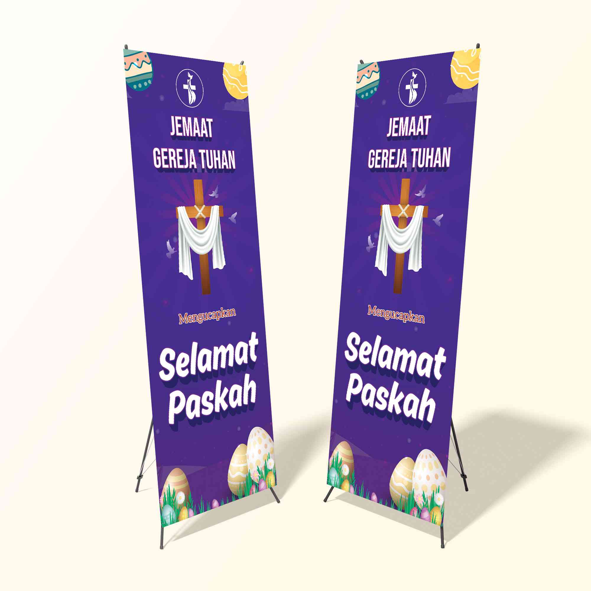 Desain X-Banner Paskah ini hadir dengan tampilan yang penuh makna. Di bagian atas, terdapat logo Jemaat Gereja Tuhan dan teks "Selamat Paskah" dengan...