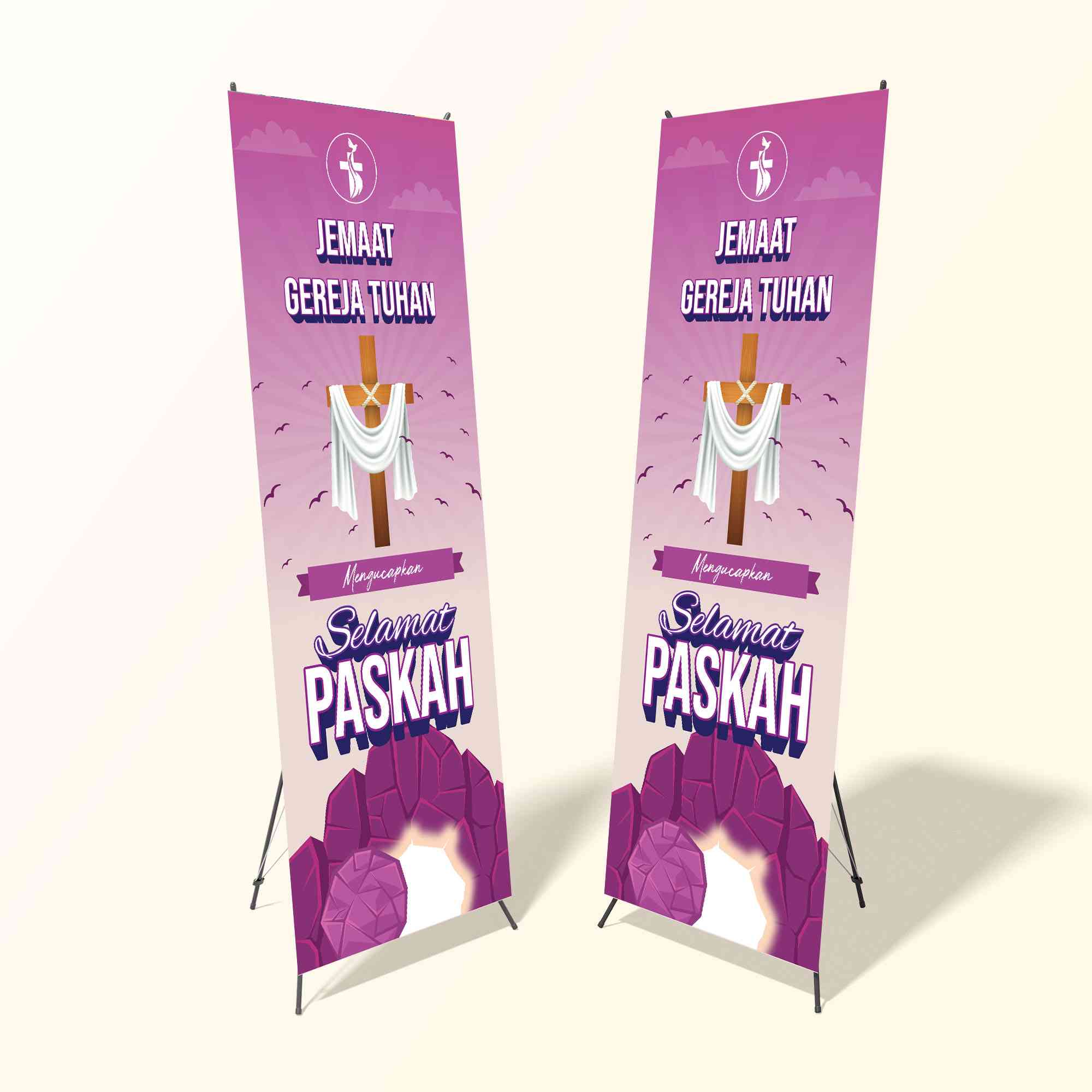 X-Banner Paskah ini menampilkan tema yang penuh sukacita dengan gambar salib yang dihiasi kain putih, melambangkan kebangkitan Yesus Kristus. Desain l...