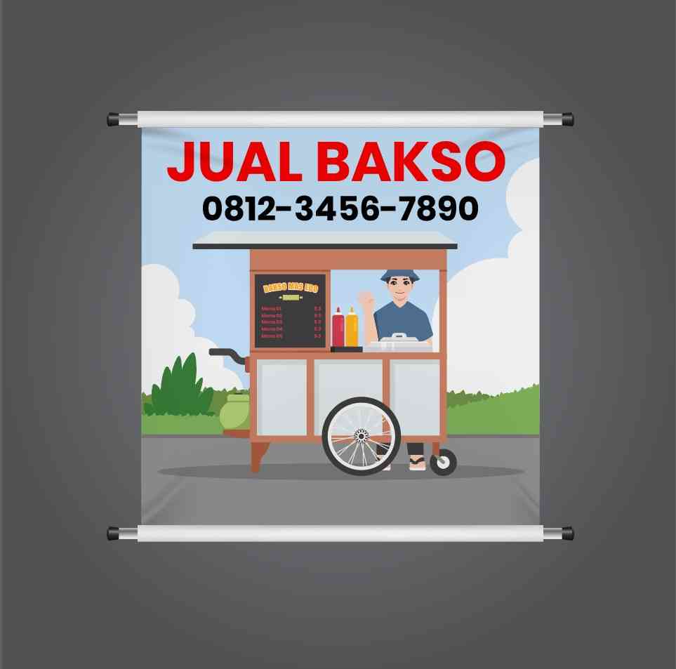 Baliho ini dirancang dengan gaya yang ceria dan mudah dibaca, cocok untuk menarik perhatian pengunjung warung bakso. Tampilan ilustrasi penjual bakso...