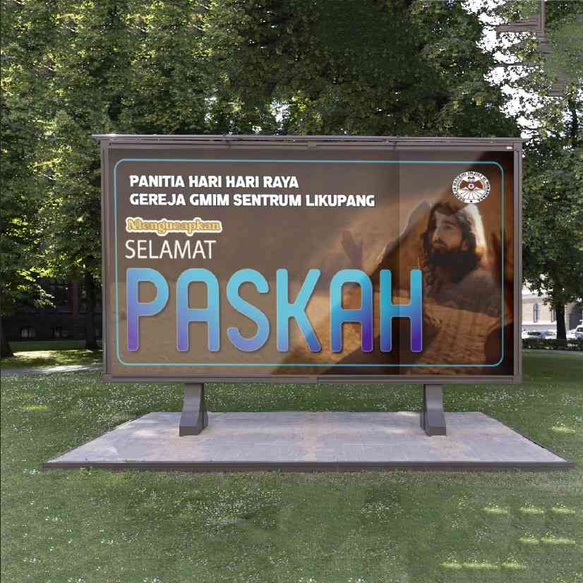 Desain baliho Paskah ini mengangkat elemen visual penuh makna, seperti salib dengan kain putih, langit yang cerah, dan awan lembut sebagai latar utama...