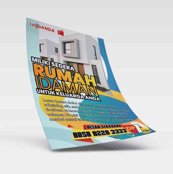 flyer brosur promosi properti bergaya modern dan minimalis sebagai media promosi, menampilkan slogan “Miliki Segera Rumah Idaman untuk Keluarga Anda”. Desain ini menggunakan kombinasi warna yang mencolok untuk menarik perhatian publik secara maksimal. Terdapat visual rumah dua lantai berarsitektur kontemporer yang menonjolkan kesan elegan dan kekinian dengan.