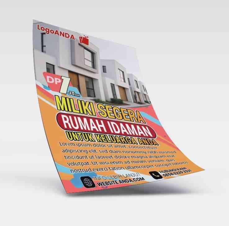 flyer brosur promosi properti bergaya modern dan minimalis sebagai media promosi, menampilkan slogan “Miliki Segera Rumah Idaman untuk Keluarga Anda”. Desain ini menggunakan kombinasi warna yang mencolok untuk menarik perhatian publik secara maksimal. Terdapat visual rumah dua lantai berarsitektur kontemporer yang menonjolkan kesan elegan dan kekinian dengan.
