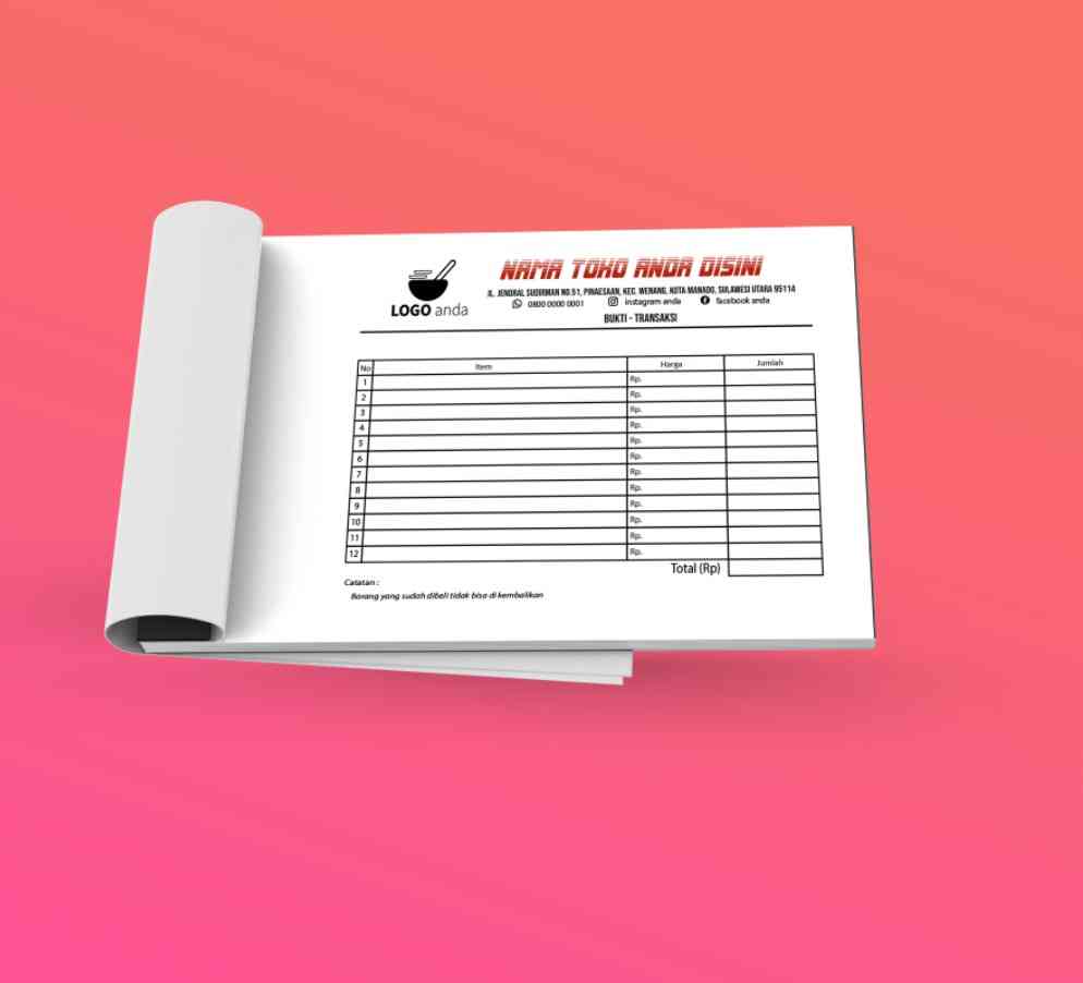 Nota makanan dengan desain minimalis dan fungsional ini dirancang khusus untuk usaha kuliner seperti warung makan, depot, kedai mie, atau rumah makan sederhana. Tampilan bersih dengan penekanan pada keterbacaan dan struktur informasi yang jelas membuat proses transaksi menjadi lebih praktis dan profesional.