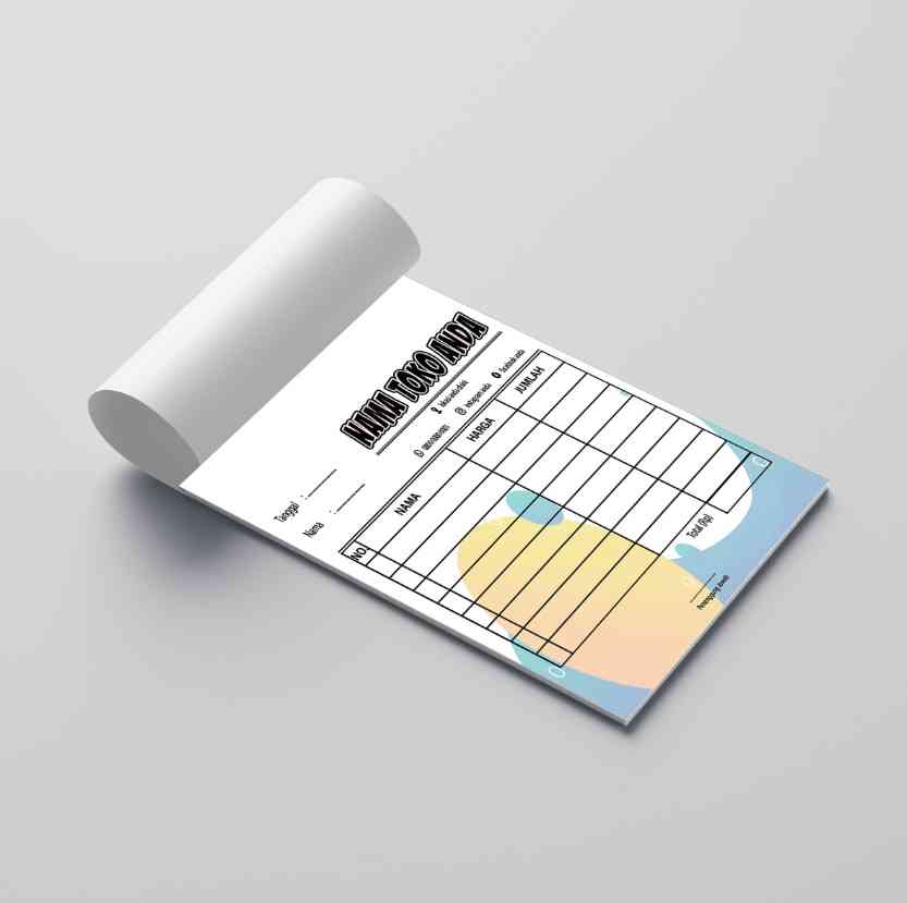 Desain nota yang modern dan fleksibel, cocok untuk berbagai jenis usaha UMKM. Dengan latar bawah bernuansa warna pastel lembut (biru, kuning, peach), nota ini memberikan kesan segar dan profesional. Teks judul “NAMA TOKO ANDA” dapat disesuaikan dengan nama bisnis Anda.
