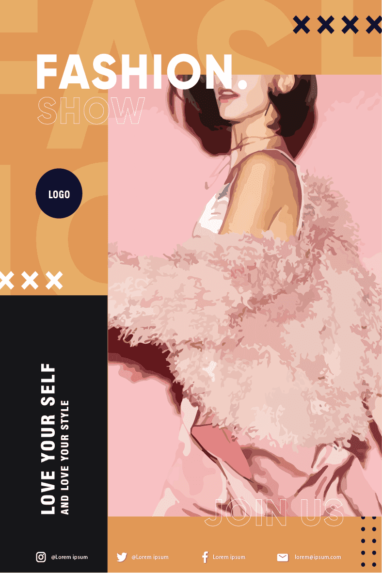 Wall poster usaha fashion dengan tema Gorgeous ini berbentuk persegi panjang vertikal dan menampilkan ilustasi digital seorang wanita berbusana modis...
