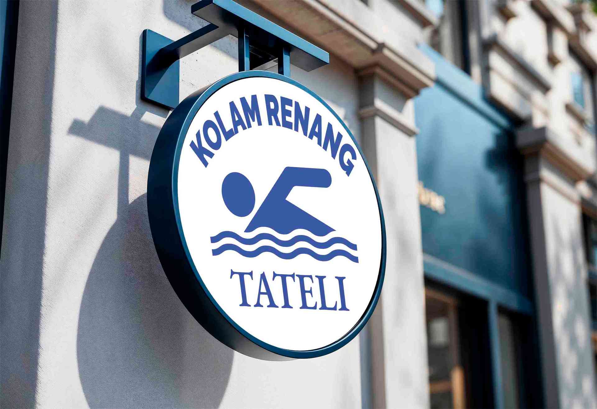 Signage ini menampilkan desain sederhana namun informatif untuk sebuah fasilitas kolam renang bernama Menggunakan bentuk lingkaran dengan latar putih...