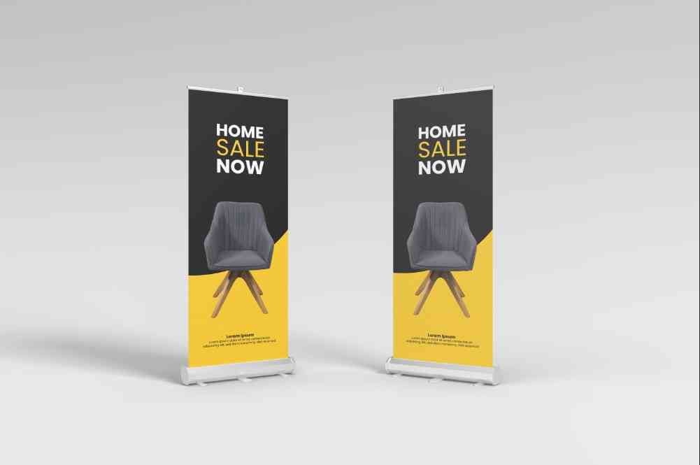 Banner ini menampilkan desain yang modern dan mencolok, dengan teks besar "HOME SALE NOW" yang langsung menarik perhatian. Latar belakang hitam member...