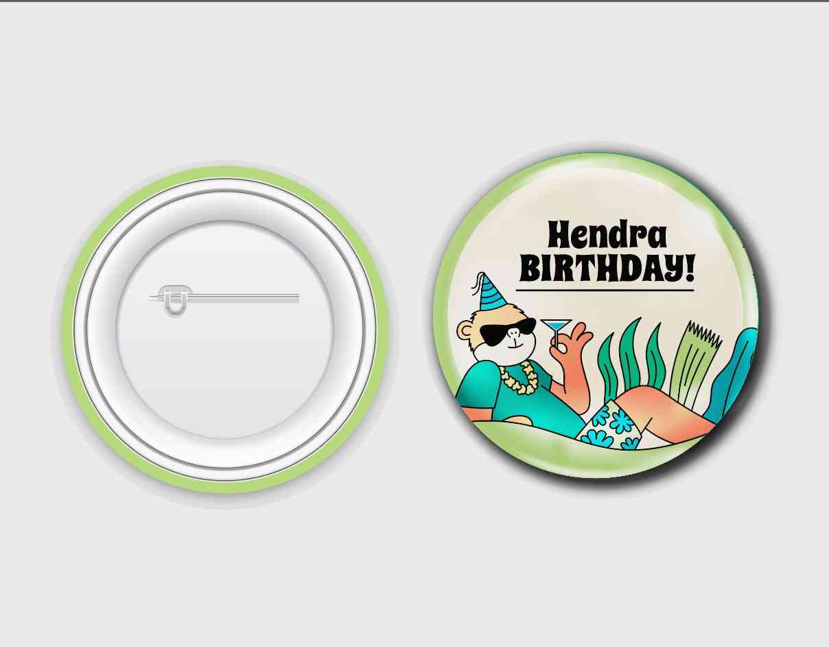 Pin ulang tahun ini menampilkan desain ceria dengan ilustrasi tropis yang penuh warna. Di bagian atas pin, nama "Hendra" dihiasi dengan huruf tebal ya...