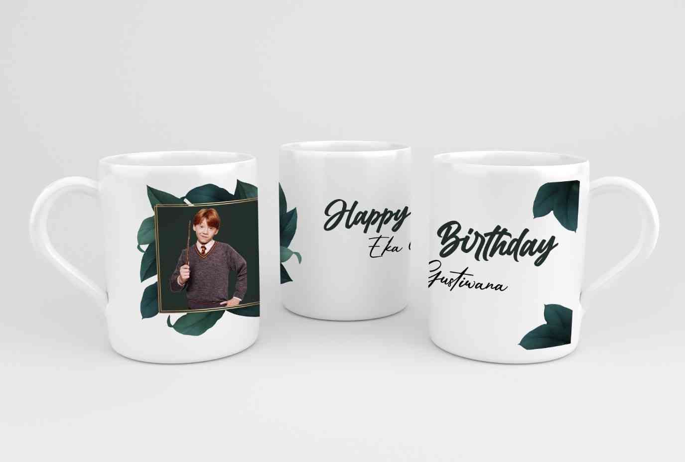 Desain mug ini memiliki tema elegan dengan kombinasi elemen klasik dan modern. Dominasi warna hijau tua dan putih memberikan kesan segar dan alami. Ba...