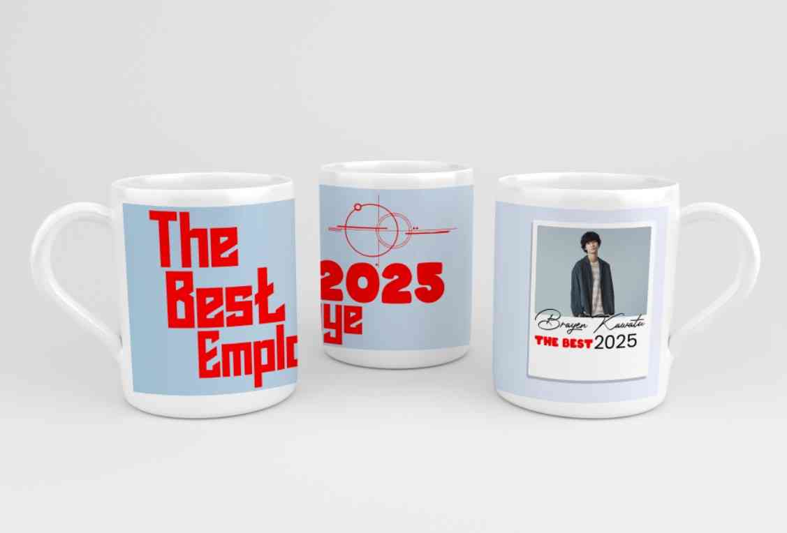 Desain mug ini mengusung tema penghargaan "The Best Employee 2025" dengan gaya modern dan futuristik. Tipografi tebal berwarna merah menciptakan kesan...